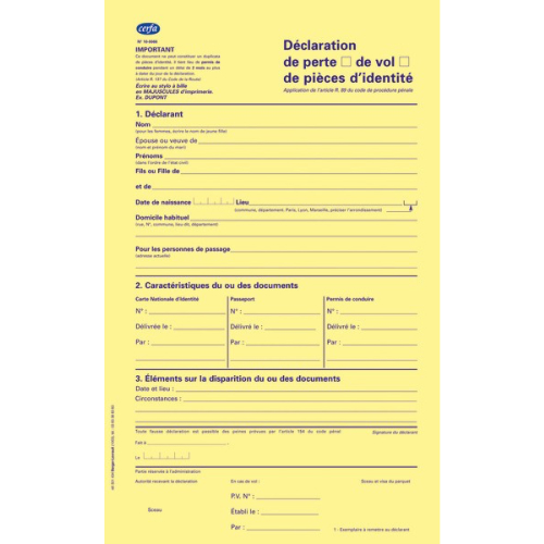 DÉCLARATION DE PERTE DE CARTE NATIONALE D’IDENTITÉ OU DE PASSEPORT
